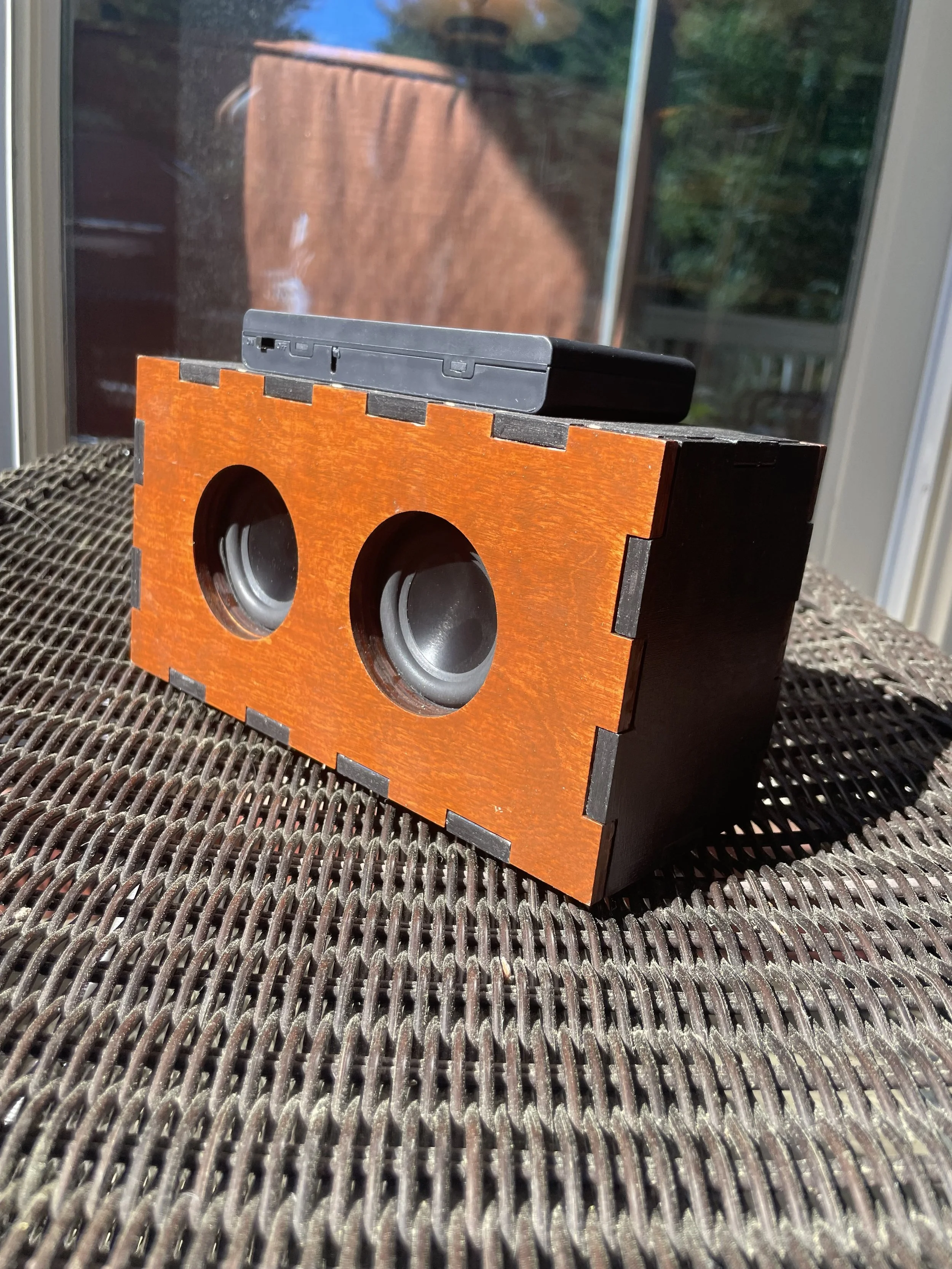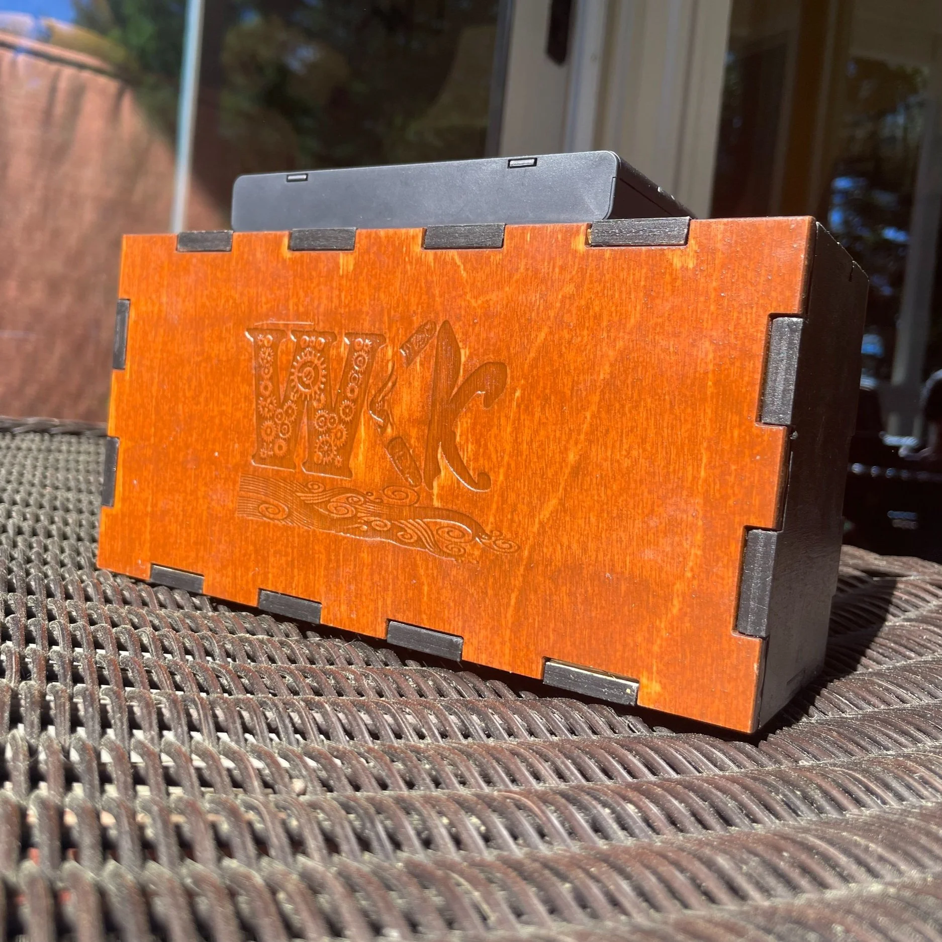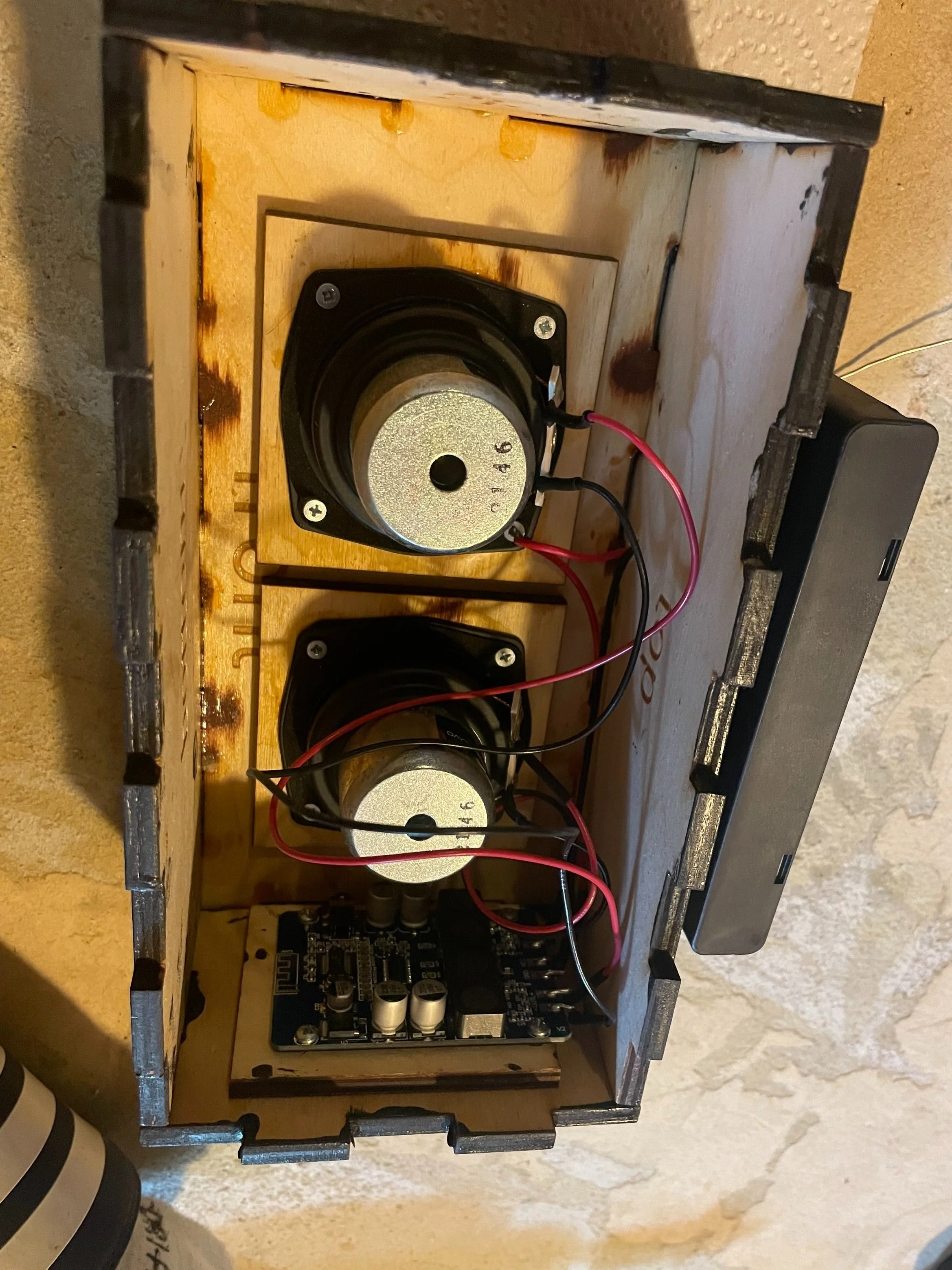 This is a speaker I put together with some spare parts I had from other prototyping projects in my basement. I soldered together the Bluetooth board, 2 full-range speaker drivers, and the battery pack and mounted them all on a custom box I had laser cut for this purpose. The back of the speaker has my logo and the battery box takes 6 AA batteries and is mounted on top because that was the only battery pack I had available at the time and I needed to have access to it to put in more batteries as they died. The box was designed to house an optimal volume for these speaker drivers and because of that the sound quality is pretty solid even though the mounting doesn’t look amazing. I stained and painted all of the wood panels before glueing them together.