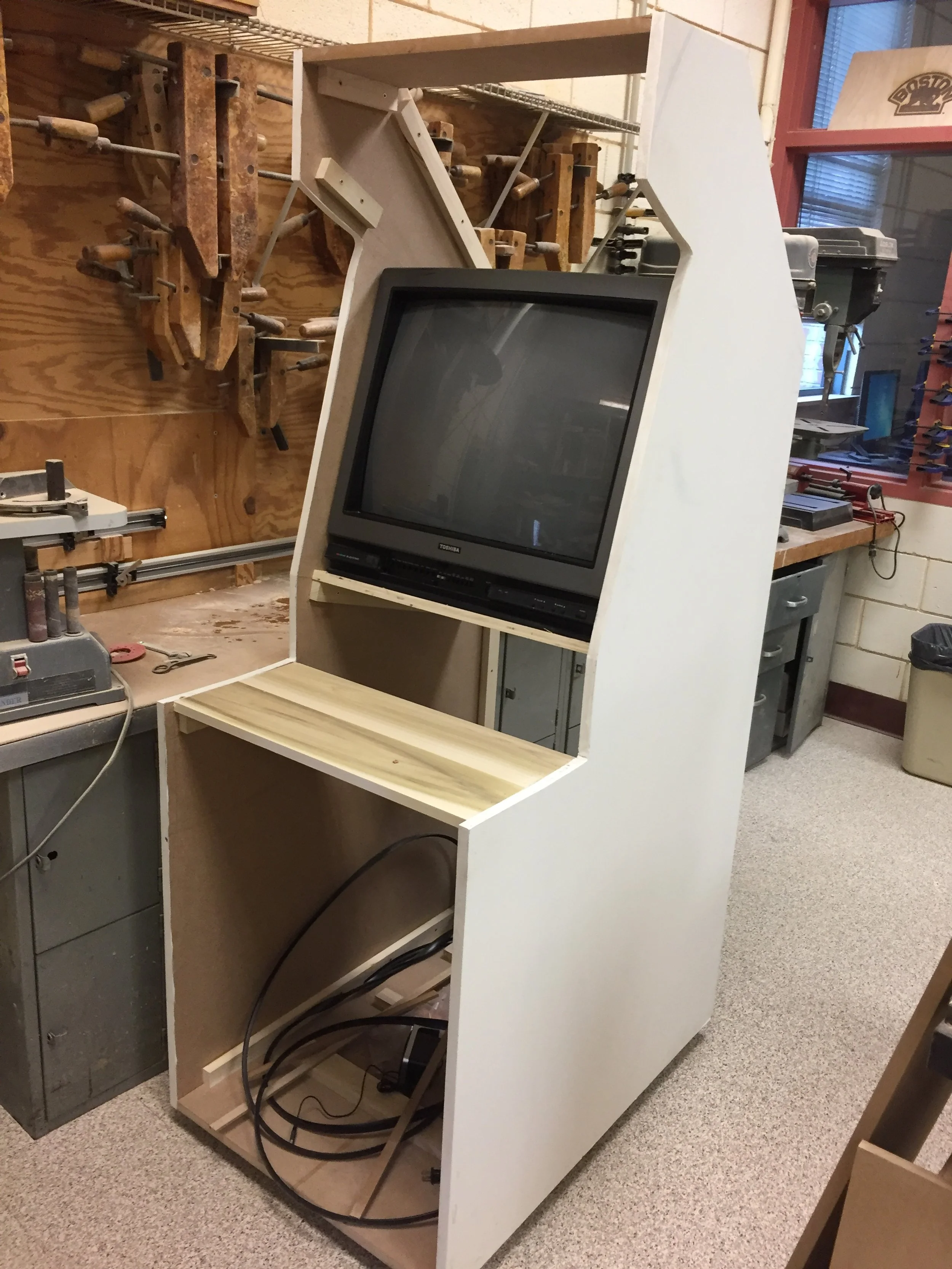 This is the bones of the machine mid-way through building it. Here you can see just the outer pieces right after they were attached along with the TV that is the screen for the device. That shelf in the middle there is where the control box with the buttons and joysticks will rest.