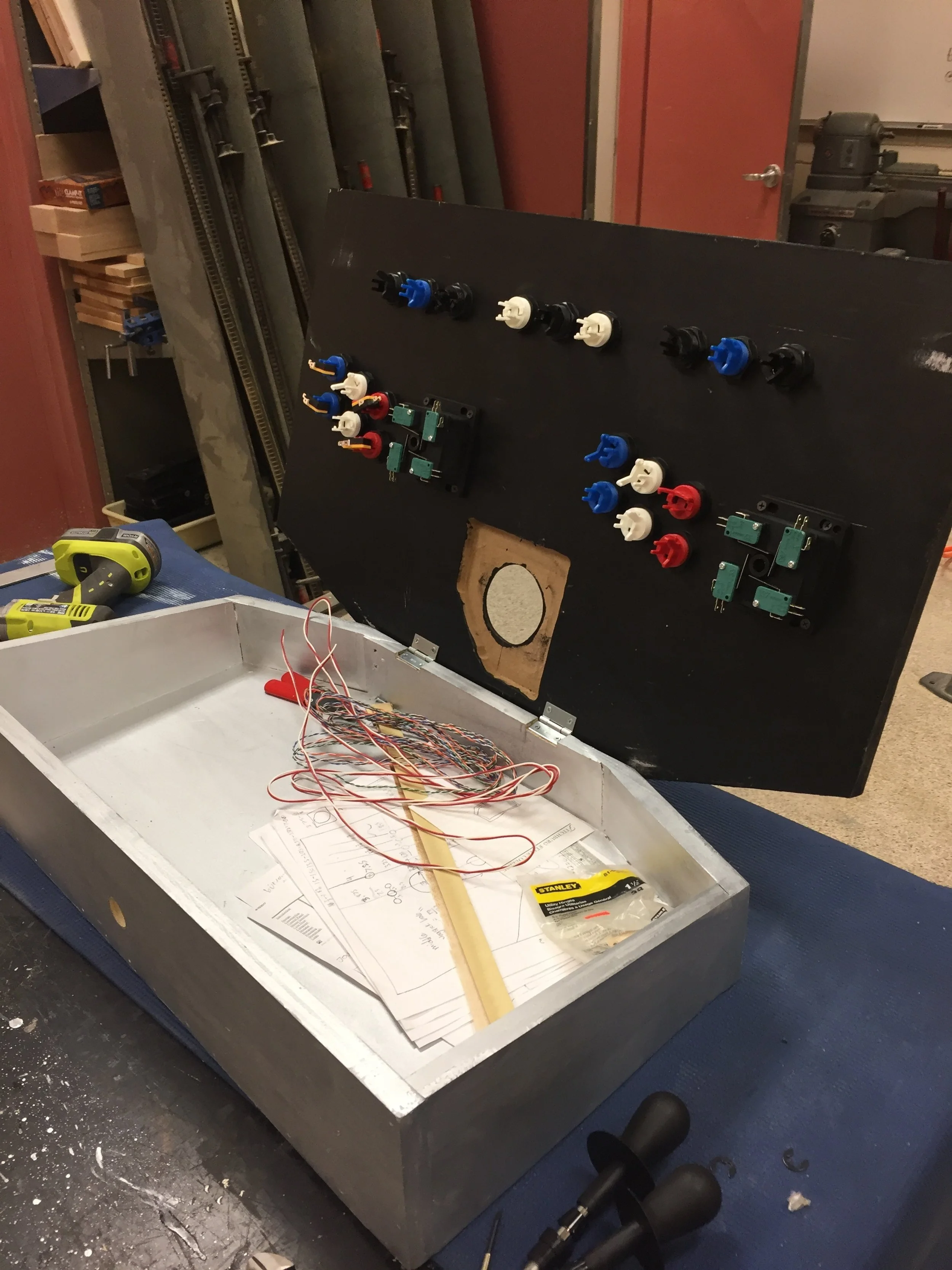Here you can see the control box as it was being wired. The pieces sticking out on the picture below are the bottoms of the buttons and the joysticks. On the left you can see how they are all being wired together.