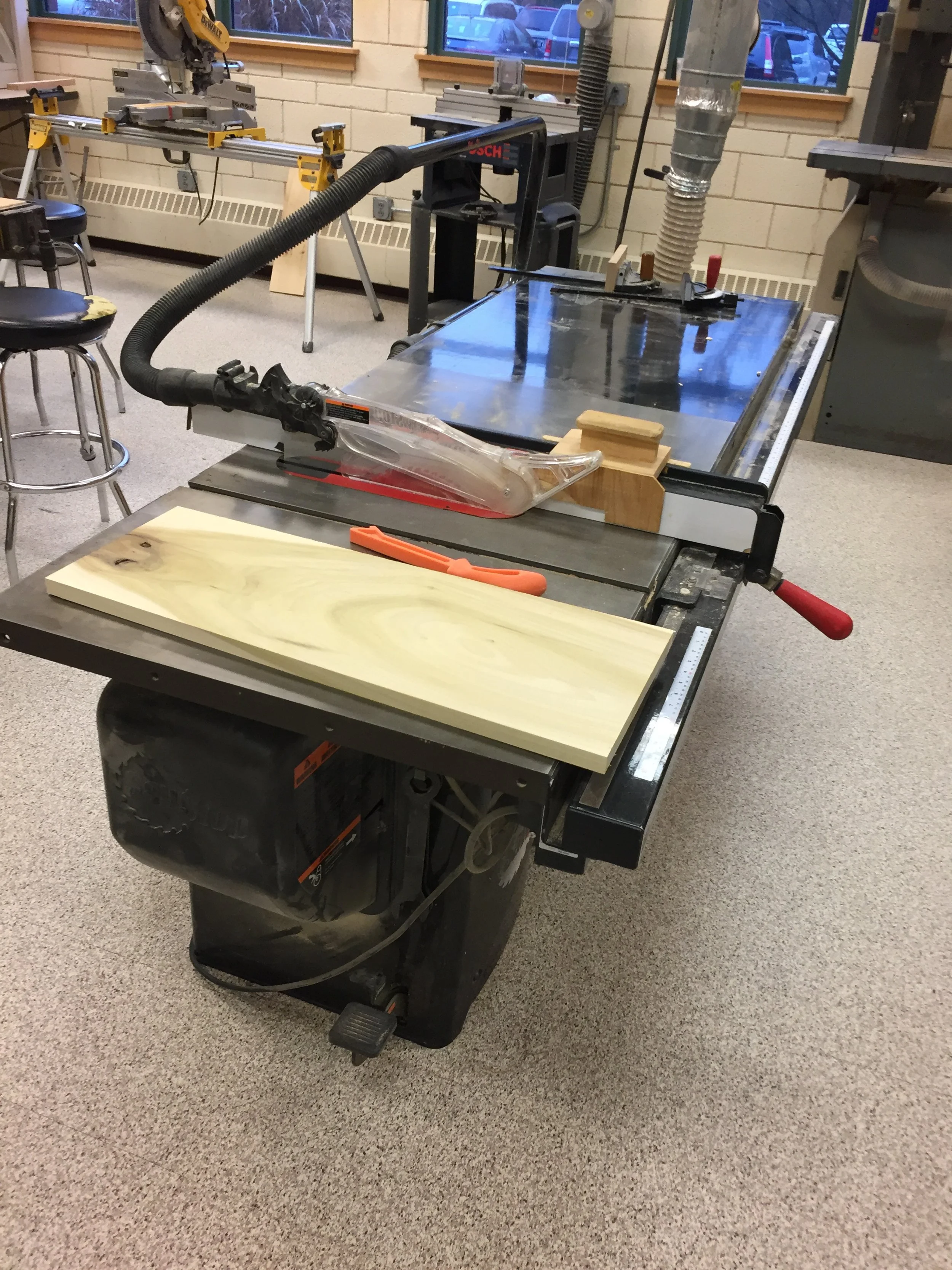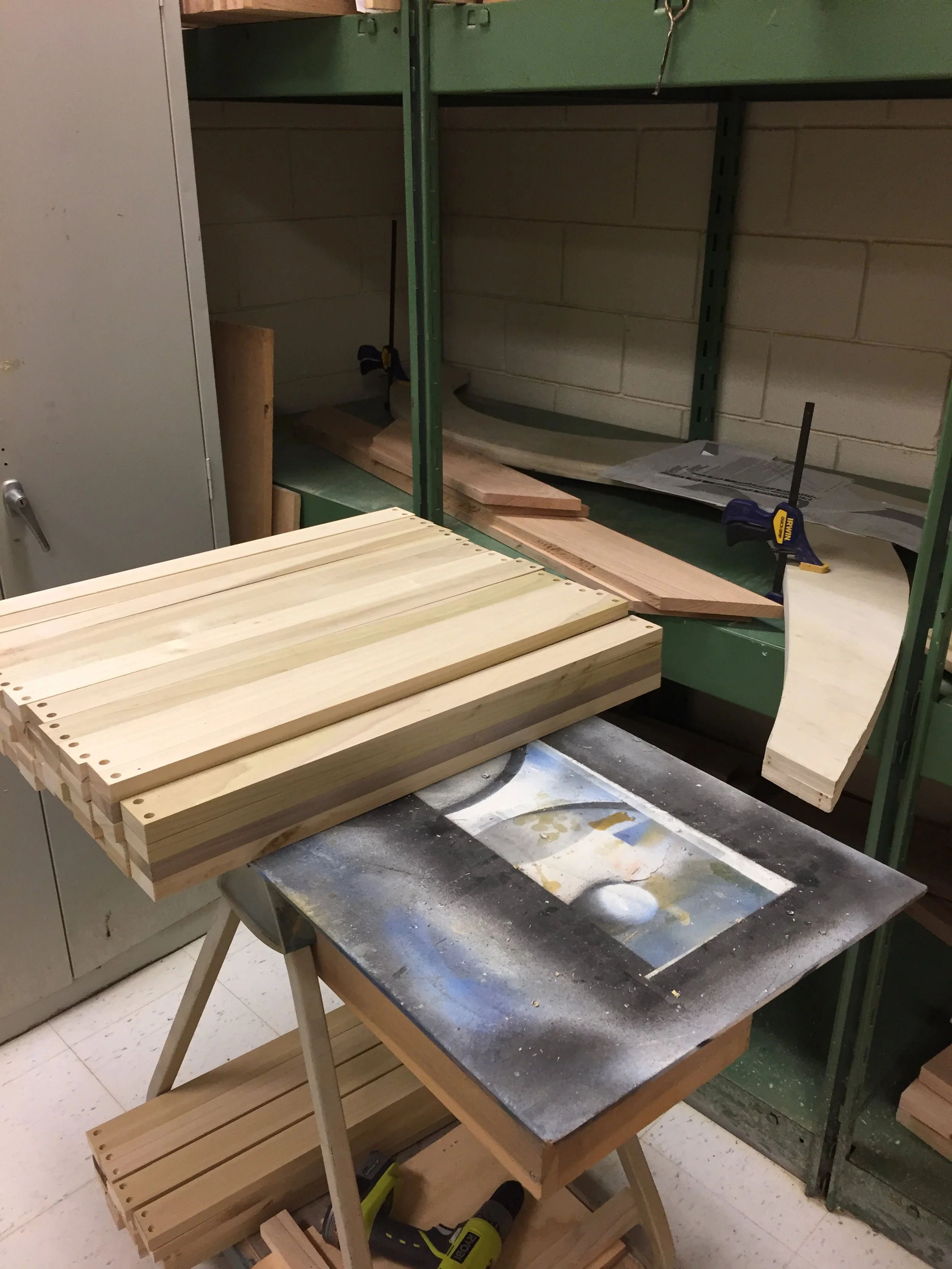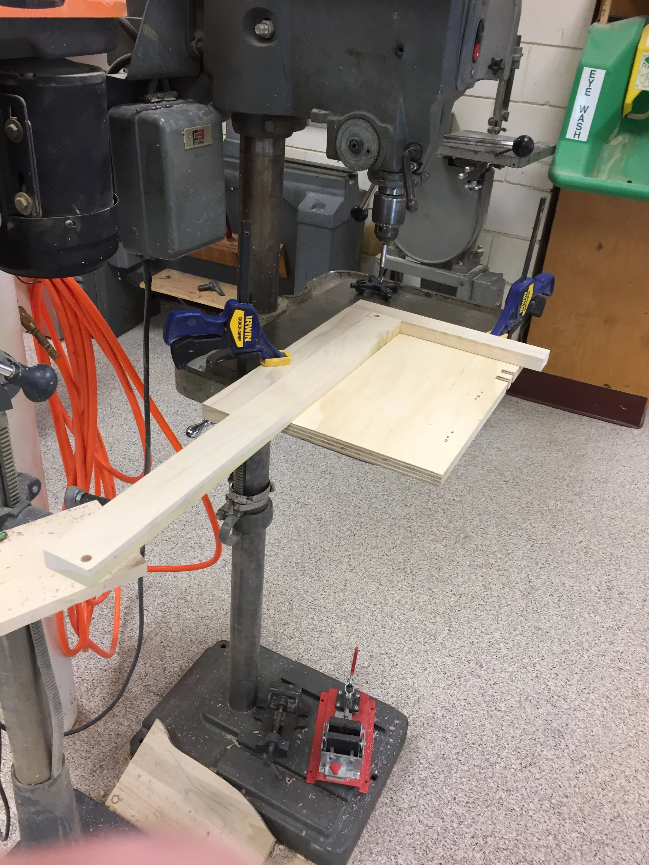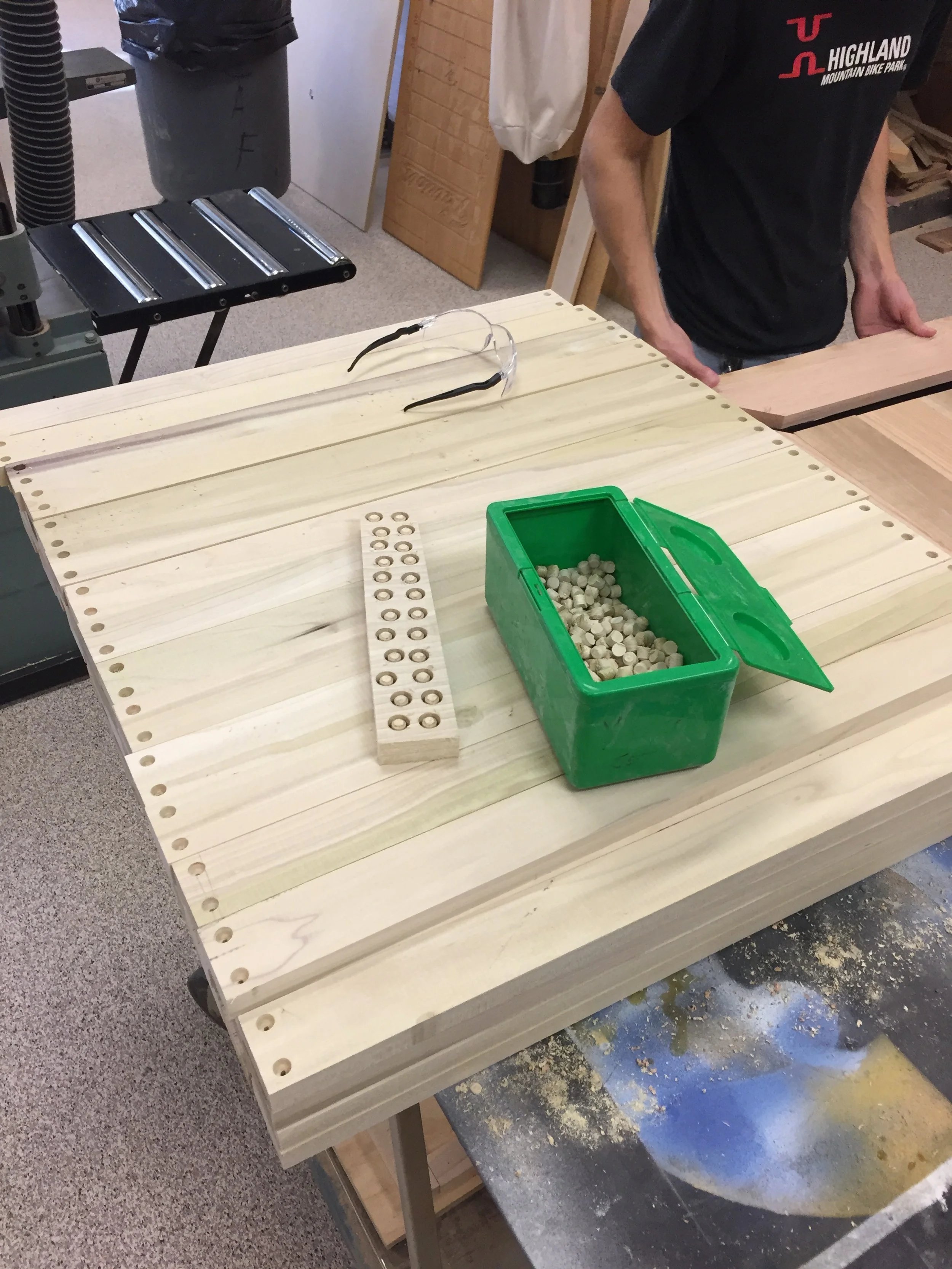 The next step of the process of making this chair was creating the cross pieces that would connect the two sides. We created these strips all equal by using a table saw on pieces of wood with equal length (pictures on the top right image). The next step was to drill holes in the ends of all the cross pieces to enable clean attachment to the two sides. To do this easily and evenly we created a corner jig on the drill press so that all we had to do was slide each piece into the jig and the drill would put the hole in the exact same place on each one (pictured in the bottom left image). The final step was to cut out a bunch of plugs to fill the holes we drilled after the attaching the pieces for aesthetic purposes.