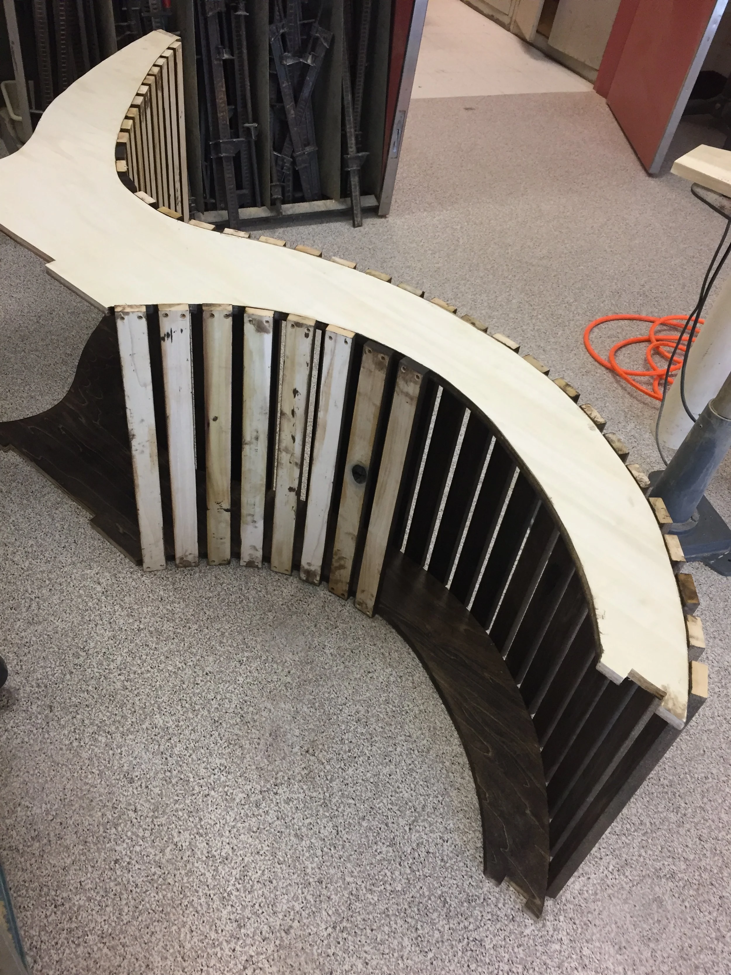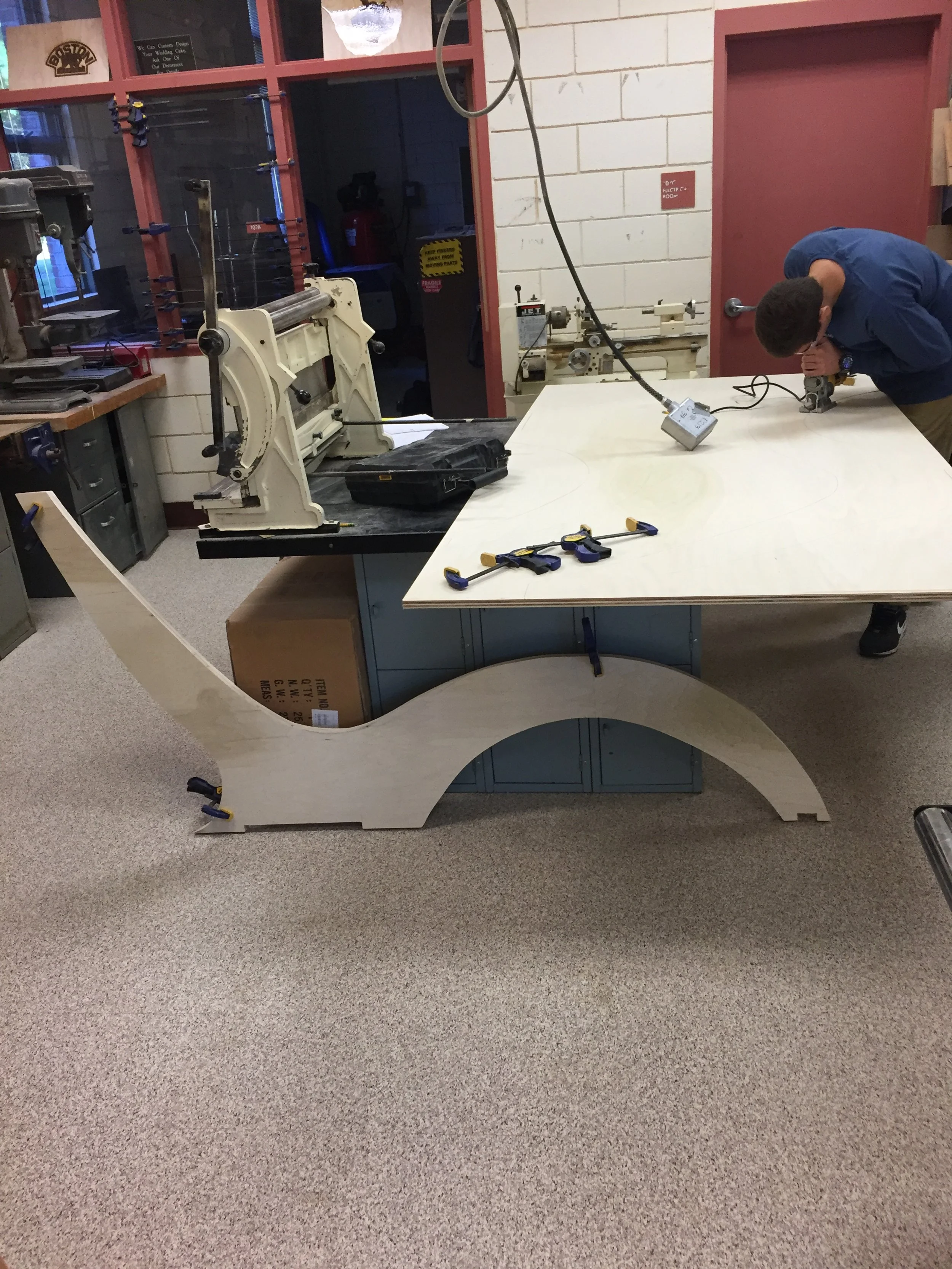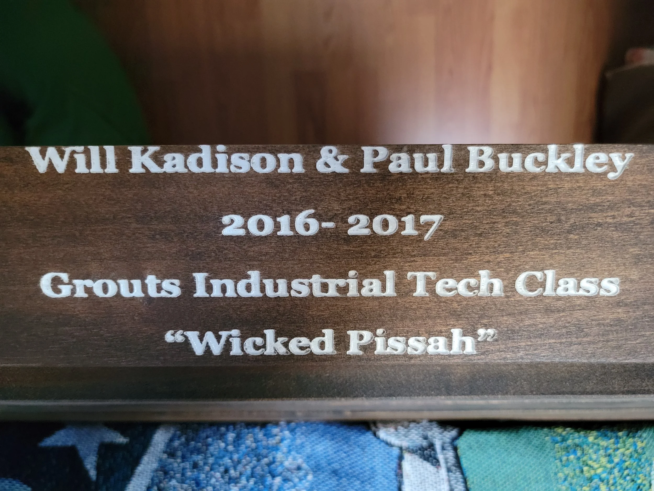 This is the dedication Paul and I put on the top of the chair. Mr. Grout was our teacher whom we were close with (even though we forgot the apostrophe on his name in the engraving). “Wicked Pissah” was a phrase we found funny that was often said in our class and we thought it would only be right to include it as part of the chair. This engraving was done with a laser cutter and the inside was filled with stain-resistant white paint.