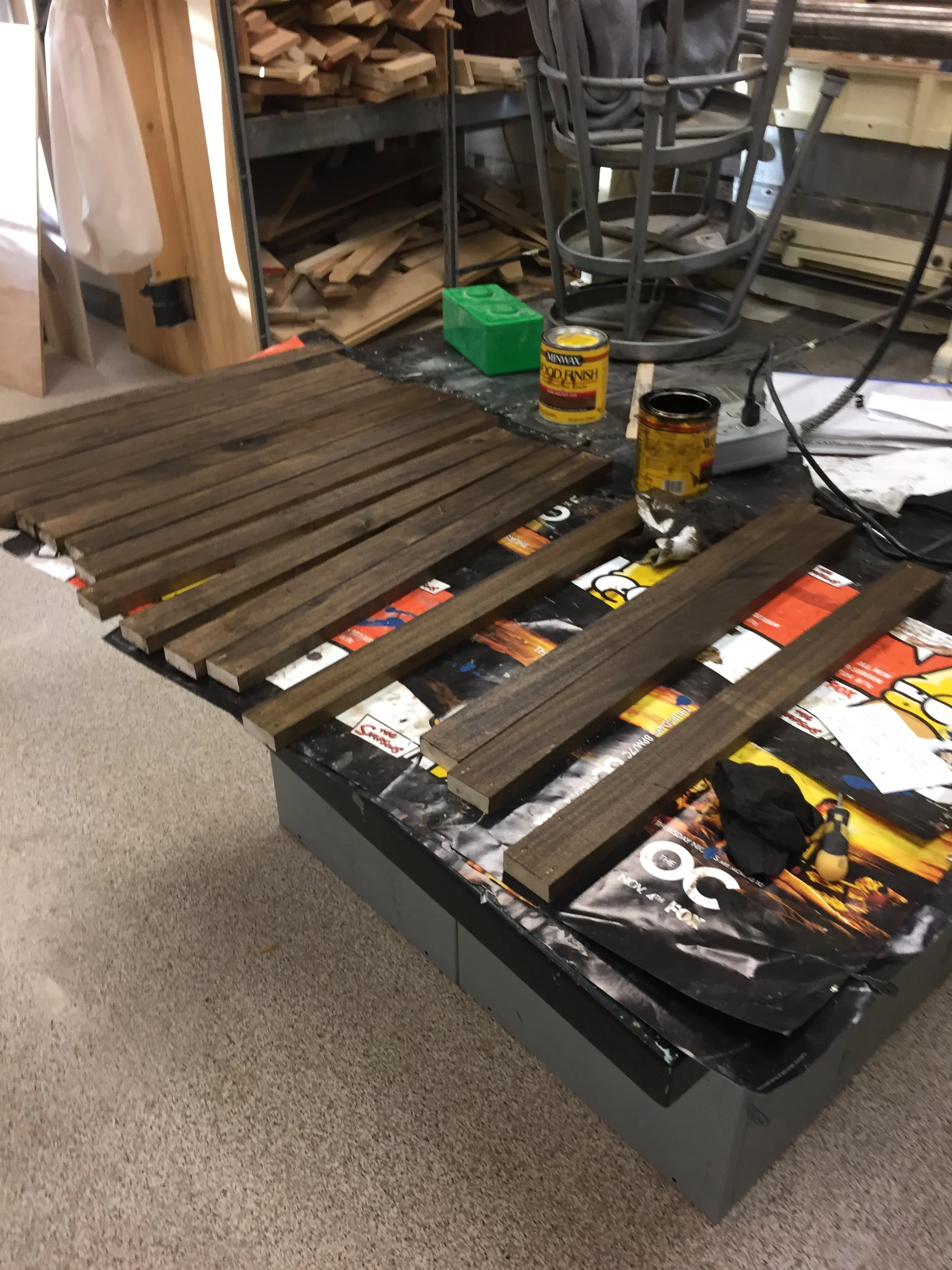 Finishing up this chair began with us staining and clear coating all of the cross pieces on every side that would not need any sanding in the future. After that, we began attaching them to the two sides and filling in the holes with our plugs (seen in the image on the right). After everything was attached, we sanded off the tops of all the cross pieces and stained the clear coated the rest of the chair.