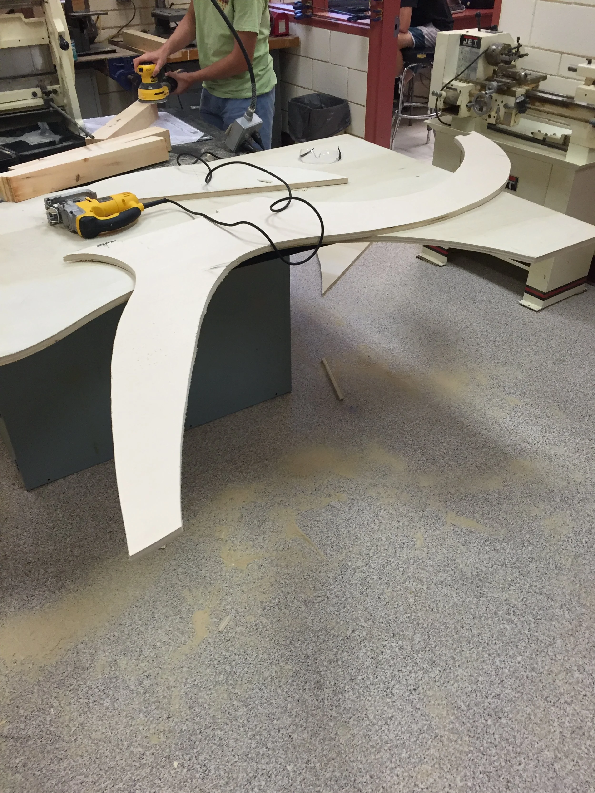 The first step in making this chair was making the two side pieces. This was done by very carefully drawing out the shapes on large sheets of plywood then carefully cutting out the shapes with a jig saw and skill saw. This was followed by sanding the two side pieces to make sure they were exactly the same size and shape.