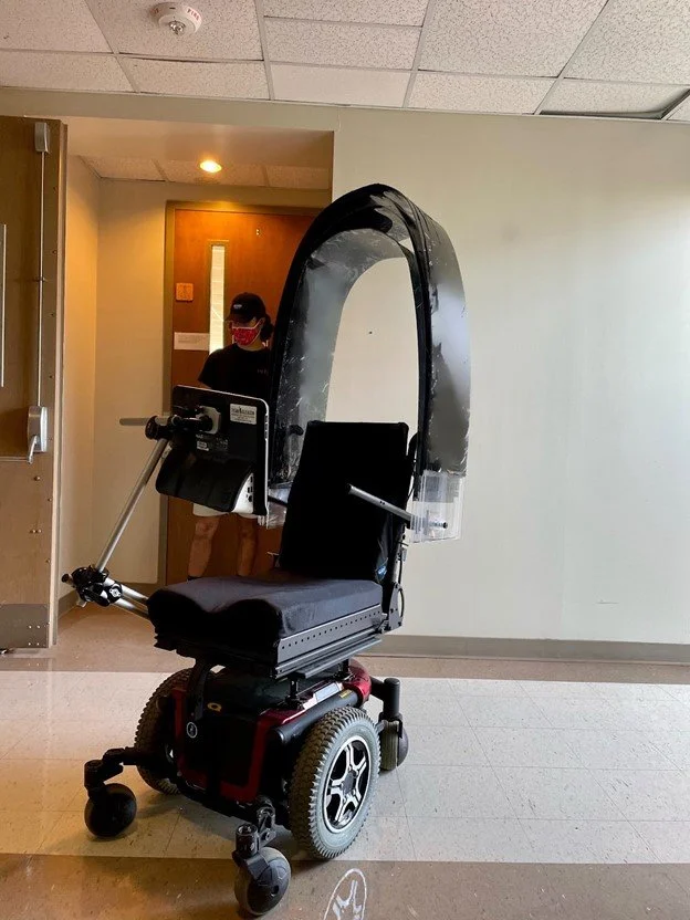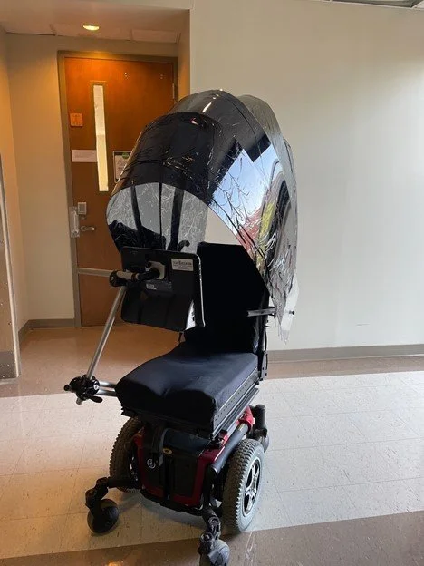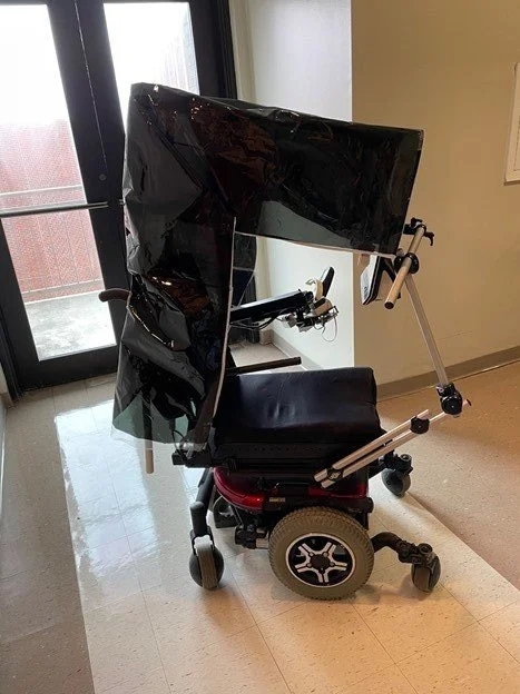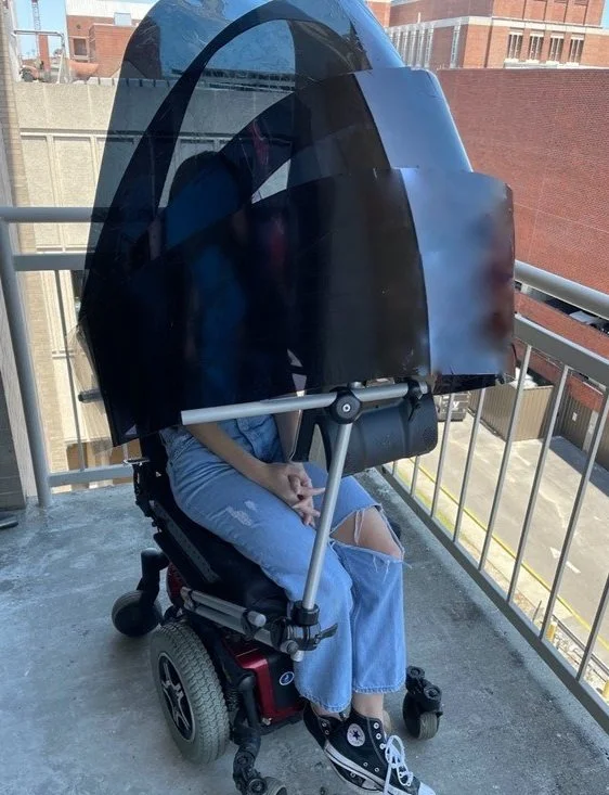 This was the first prototype we created. It was not retractable. This prototype had PVC pipe making up its internal structure with an attachment point at the back of the chair. The covering over the structure was made up of a plastic couch protector cut to our dimensions with infrared blocking car window tint applied. The tint did not apply very evenly to this very flexible surface and had many bubbles. One of the issues with this prototype was that the back attachment point was much less universal among powered wheelchairs that the bolts that connects the arms of the chair. Another issue with this prototype was that it was not very stable or visually appealing. A third, and most important issue with this prototype, was that it did not provide enough coverage to block out all of the infrared interfering with the eye tracking technology. The sides of the user also need to be covered as sunlight bouncing off the ground and into the line of use by the eye tracking technology also negatively affected its use.