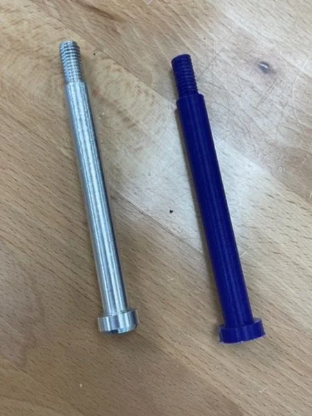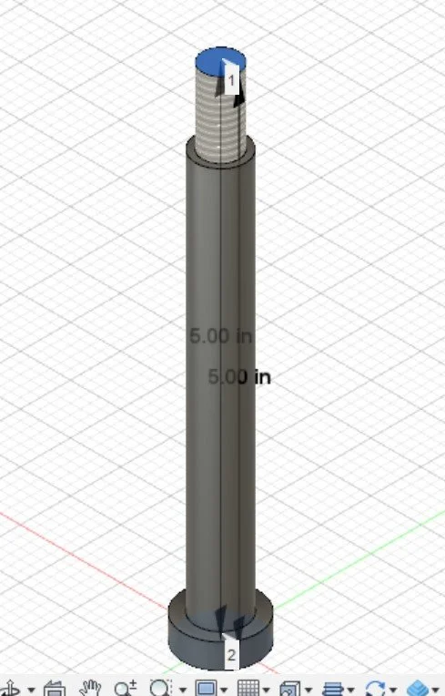 The connection point of our awning to our chair was this bolt. The one that came with the chair was not long enough to allow for further attachments aside from the arm of the chair itself. I started by designing a longer model of this bolt in Fusion 360 for my group to use as the attachment point which can be seen in the image on the left. I first 3D printed it to make sure it would fit and then machined a metal version of it on the CNC lathe in the Tulane MakerSpace which can be seen in the middle picture. Unfortunately, the thread count I determined from the original bolt was incorrect due to it having been worn down by time and continual use and the machined bolt did not fit perfectly. This led us to eventually order correctly sized bolts from McMaster as we did not have time to remanufacture. The image on the right shows the bolt being attached with the awning connected to the chair.