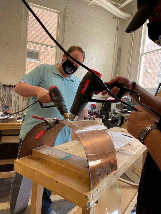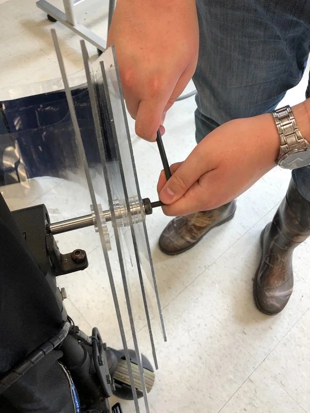 We decided to make our awning out of acrylic fitted with car window tint after determining that this would block the necessary amount of infrared to allow the eye tracking technology to function properly in direct sunlight. We started with one large sheet of acrylic which we then cut into one foot wide strips. We then created the mold seen in the left image using bent metal and wood to bend all the acrylic strips to the same angle. After that, we applied careful and consistent heat to the sheets of acrylic allowing them to all bend evenly over our mold and become the right shape. We then drilled holes in the bottom of each strip on each side to allow for them to be attached to the chair. We also reinforced these holes with acrylic washers, that I designed and cut on a laser cutter in the Tulane MakerSpace, in order to be sure they wouldn’t crack while in use. The image on the right shows one of the acrylic sheets after shaping before the infrared blocking tint was applied.
