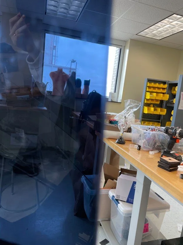 After preliminary testing, we decided we would use acrylic fitted with car window tint to block the infrared rather than a welding curtain that we had previously discussed. This car window tint put onto the acrylic blocked enough infrared for the eye tracking technology inside of its protection to function properly. In the image on the left you can see the visibility through the tint versus regular visibility. The image on the right shows our awning applied to the chair with only one acrylic strip tinted so that the contrast between the tinted and un-tinted can be easily seen.
