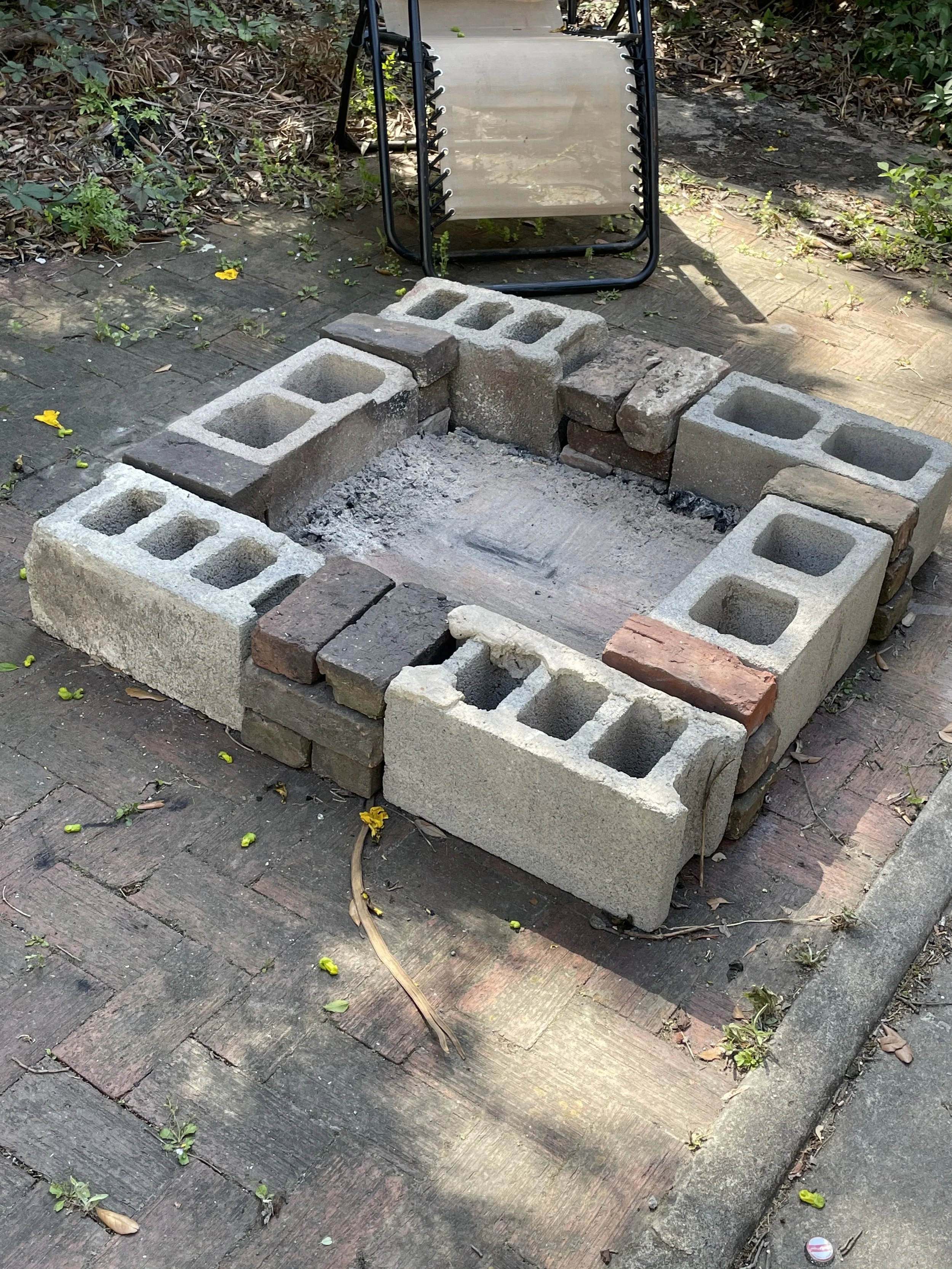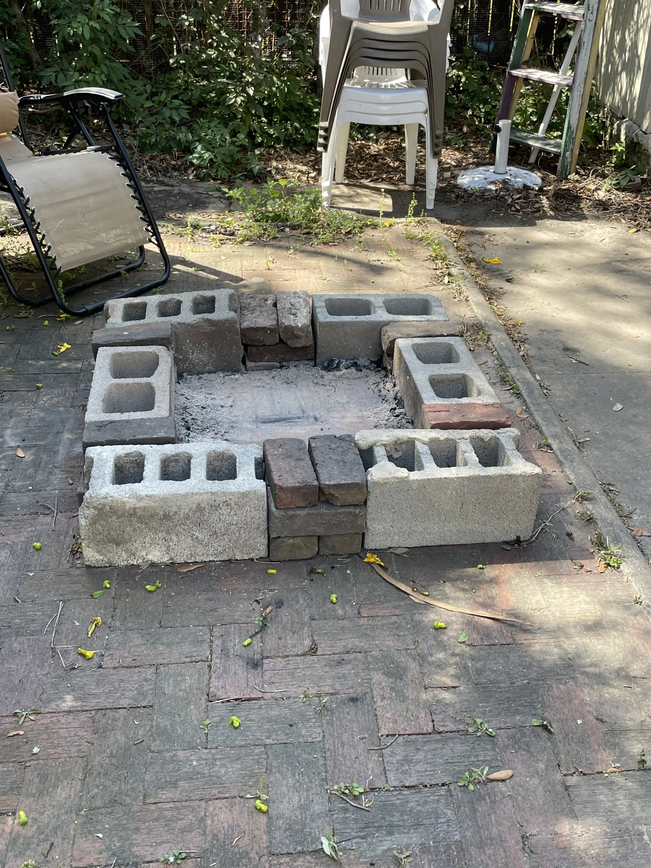This was a fire pit that I built in my backyard during my senior year of college at Tulane. It is made out of bricks and cinderblocks that I found around my block along with some large brick slabs that make up the base.