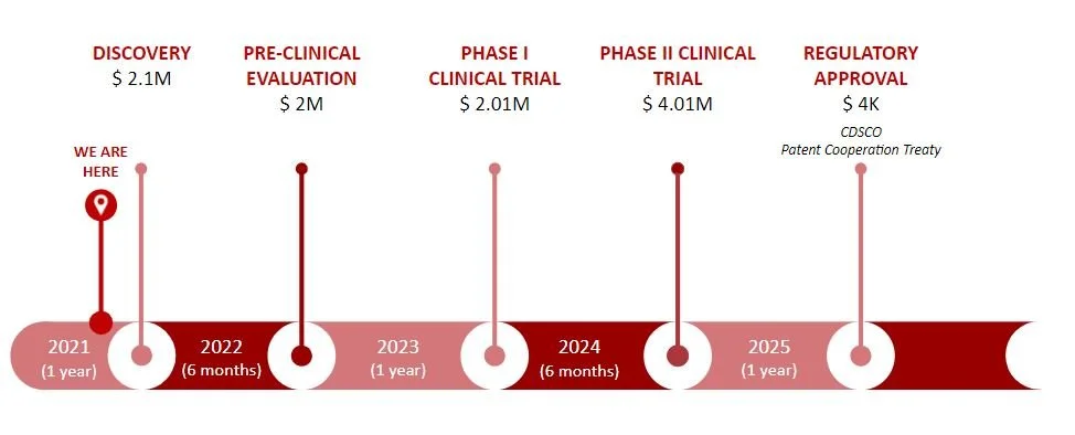 Our path-to-market is divided into five different stages. We are currently at the discovery stage, with a killer experiment performed and working towards our minimum viable product. We would then move to our pre-clinical evaluation to start with initial testing and get more data on the specifics of our device, such as safety and efficacy. For our clinical trials, we would assess ease of use for the ASHA workers and market implementation, starting in a few villages and then moving on to the states of Uttar Pradesh and Bihar to assess adoption by the rest of India. Finally, we would seek regulatory approval at the 4-year mark. To bring our product to market we would need $10M to help us navigate through these key milestones.