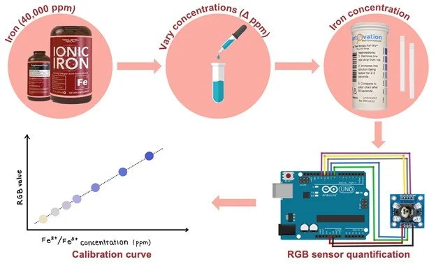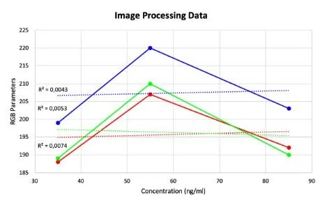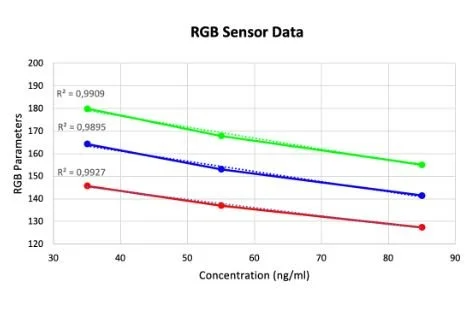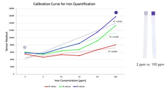 Due to time constraints we were unable to perform testing with an actual lateral flow immunoassay and our chosen biomarkers. Instead, we used solutions with different iron concentrations and commercially available iron test strips. The concept we wanted to prove was that we could use an RGB sensor to quantify the concentration of a substance in a solution based on the darkness of the test result. The iron tests we used gave qualitative results using different shades of blue to correspond to different concentrations of iron. We created solutions with different known concentrations and used the test strip on each solution. We then quantified the darkness of each strip using an RGB sensor connected to an Arduino. We used the solutions with known concentrations and corresponding RGB values to construct a calibration curve that would allow us to determine the concentration in an unknown solution using the RGB values, thus proving our concept. As you can see from the graph on the right the results were quite promising. As the test results were given in shades of blue, we would expect the trendline for the blue values given from the RGB sensor to be the closest to what we wanted which is what we see in the graph. While the results were not perfect they were certainly promising and warrant further testing. For our device in the future, we would need to create these calibration curves for all four of our biomarkers. We would do this by creating solutions with known concentrations of each one, then running the solutions through our lateral flow immunoassay and quantifying the darkness of the resultant test lines using the RGB sensor and Arduino.