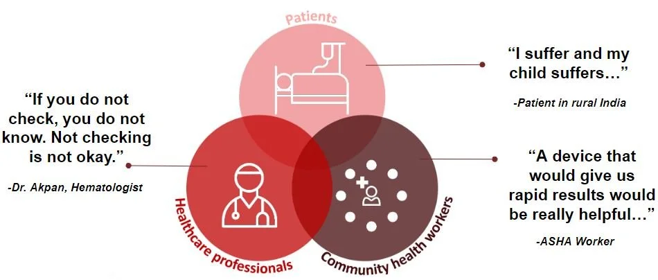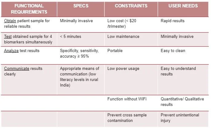 We interviewed many people including a variety of stakeholders spanning from patients to healthcare professionals and community health workers like the aforementioned ASHA workers. Some key insights that truly validated our need really occurred after interviewing and speaking to an ASHA worker where it was explicitly stated that a device that would give rapid results would be extremely helpful especially since there aren’t really any reliable means of transportation to hospitals in rural India. She also validated that proper levels of these four specific biomarkers are crucial for fetal development. Additionally, Dr. Akpan, who runs a women’s health clinic for several blood disorders, validated our unmet need by stating that there truly is merit in proper diagnosis of these risk factors because it serves as motivation for mothers to take their supplements or take action on their specific course of treatment.