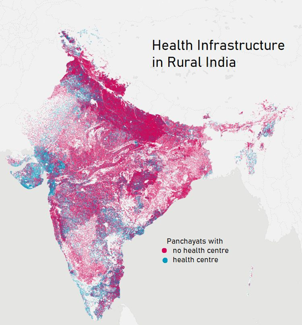 The healthcare infrastructure in rural India is not very accessible as we can see displayed on the map. 73% of villages do not have access to a health center with doctors, nurses, and lab techs. And about 90 million people have to travel more than 10 km to reach a health center. These are some reasons we thought a point-of-care device would be most helpful to these communities.