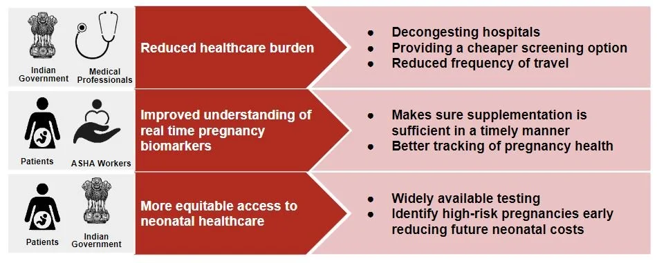 ASHA workers are accredited social health activists. ASHA workers are women who live in these villages and are trained in performing basic health check-ups and disseminating health information. They move door to door keeping track of the community’s health and connecting them with the public health system. Lastly, they assign each pregnant patient an antenatal card where the patient's vitals, supplementation, and future check-ups are recorded and tracked. We envision the ASHA workers to be the ones who will use our device and interpret the results for the pregnant women. ASHA workers already carry and provide supplementation for deficiencies in these four biomarkers but there is a large lack of motivation on the part of the pregnant mothers to take the supplements which is one thing we hope our device will help with.