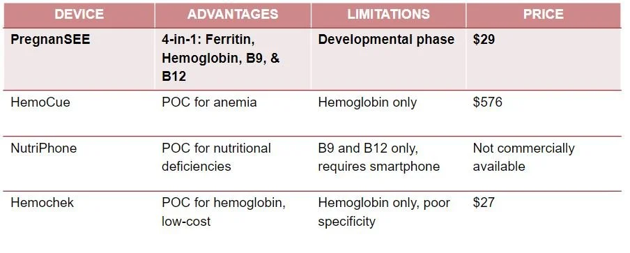 Here is a comparison of our product to point-of-care devices designed for nutritional monitoring that have been tested and implemented in rural India in some capacity. These work similarly to our device but none of these are in direct competition with our device as they only measure one to two of our 4 biomarkers. Through our stakeholder interviews, we found that qualitative hemoglobin checks such as Hemochek are used in rural India but this device only measures hemoglobin and is often inaccurate as the results contradict hospital lab tests.
