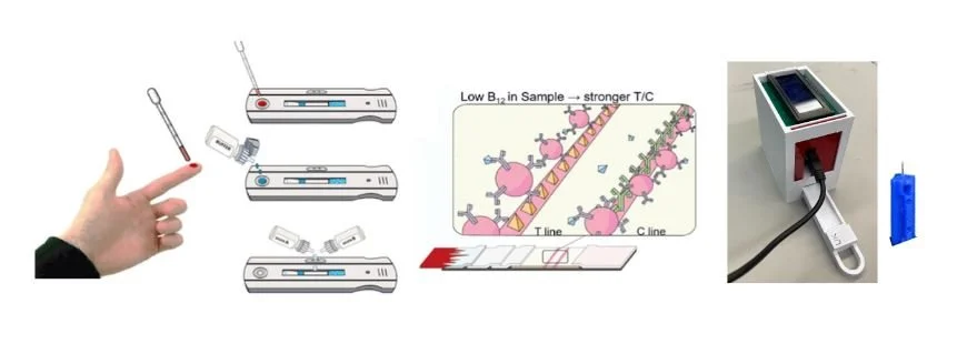 Our device will use a lateral flow immunoassay to test the sample. First, the patient will have their finger pricked by the ASHA worker using a lancet, which the ASHA workers are already trained to do and currently do. Next, the patient will put a drop of blood, followed by a few drops of buffer solution, onto our test strip which will be sitting in a drawer. Then, the drawer with the test strip inside will be placed into our device and the test will be completed. Following that, the results of the test will be quantified using a color sensor, the RGB sensor mentioned above. With the quantified results, the levels of the biomarkers will be displayed on the screen and then interpreted by the ASHA workers and relayed to the patient. Lateral flow immunoassays generally give binary results where the test line is either present or not present such as in a pregnancy test. However, according to our research, we believe we can quantify the test results by measuring the darkness of the test line in order to generate a corresponding concentration in the patient’s blood. We would need to first calibrate our device using solutions of known concentrations of our biomarkers in order to properly have our device determine the corresponding concentrations from the darkness of the test lines. We also believe we can test for all four of our biomarkers in one test strip but need to confirm this with further testing.