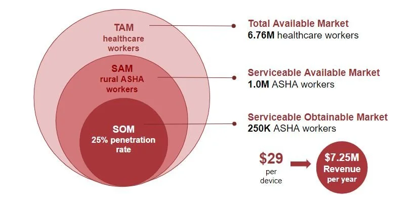 As for our initial market analysis, we decided to focus on healthcare workers who would be operating our device. We found that as of 2021 there are approximately 6.76 million healthcare workers in India which we choose as our total available market. Next, we define our serviceable available market as the 1M ASHA workers currently employed by the central government. Assuming a penetration rate of about 25% we get a serviceable obtainable market of 250K ASHA workers. Pricing our device at $29 we obtain a yearly revenue of 7.25 million dollars.
