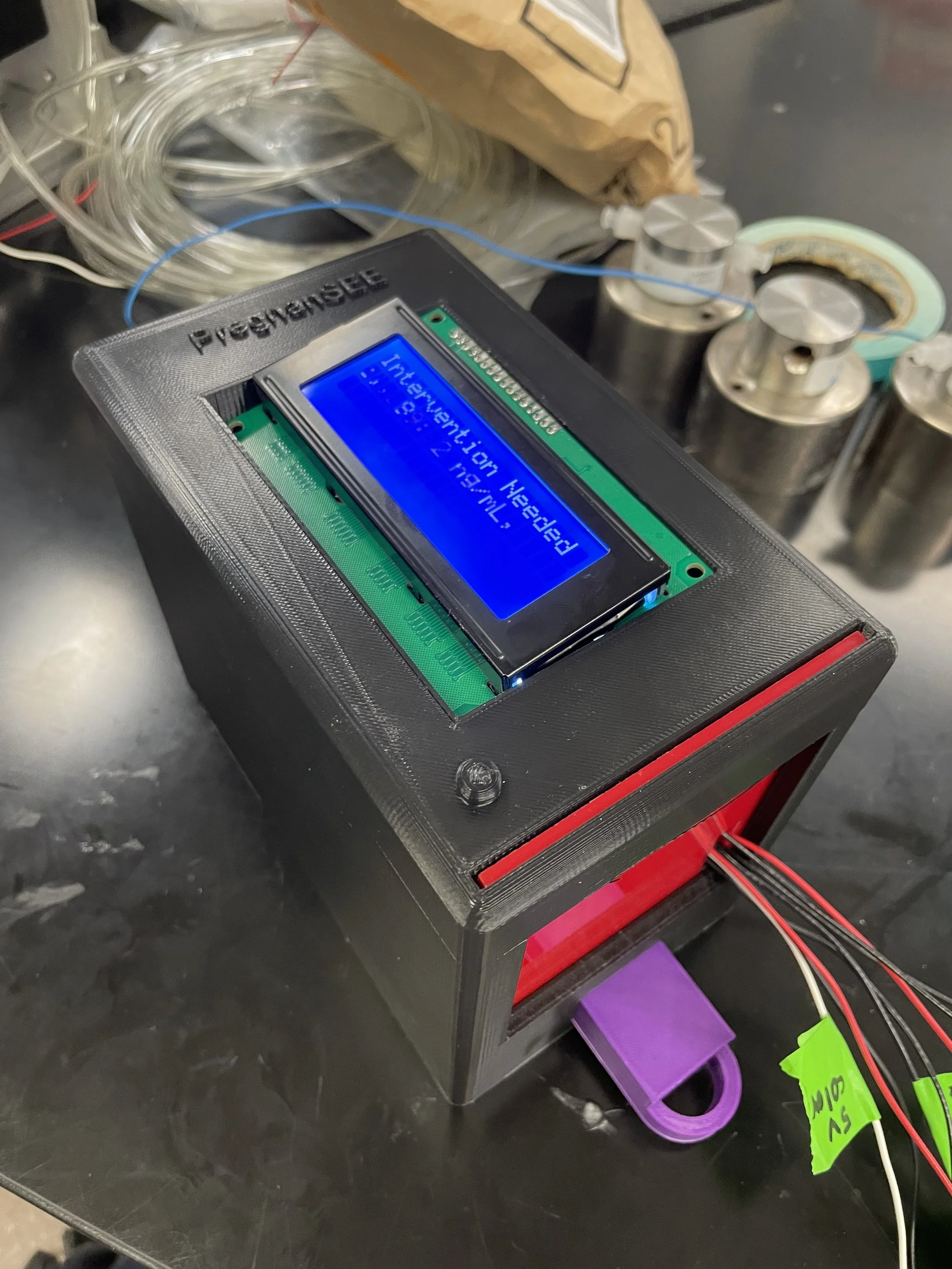 This was the first working prototype that we developed. This is also the prototype used in our killer experiment. I designed this prototype in CAD with input from my teammates. This prototype was a bit bulkier than we were looking for as our device is meant to be a tool carried by ASHA workers on their person for day-to-day use. The bulkiness led us to the next prototype model. This prototype included the RGB sensor, an Arduino, and an LCD screen. The rest of the parts were 3D printed in the Columbia Biomedical Engineering Lab.