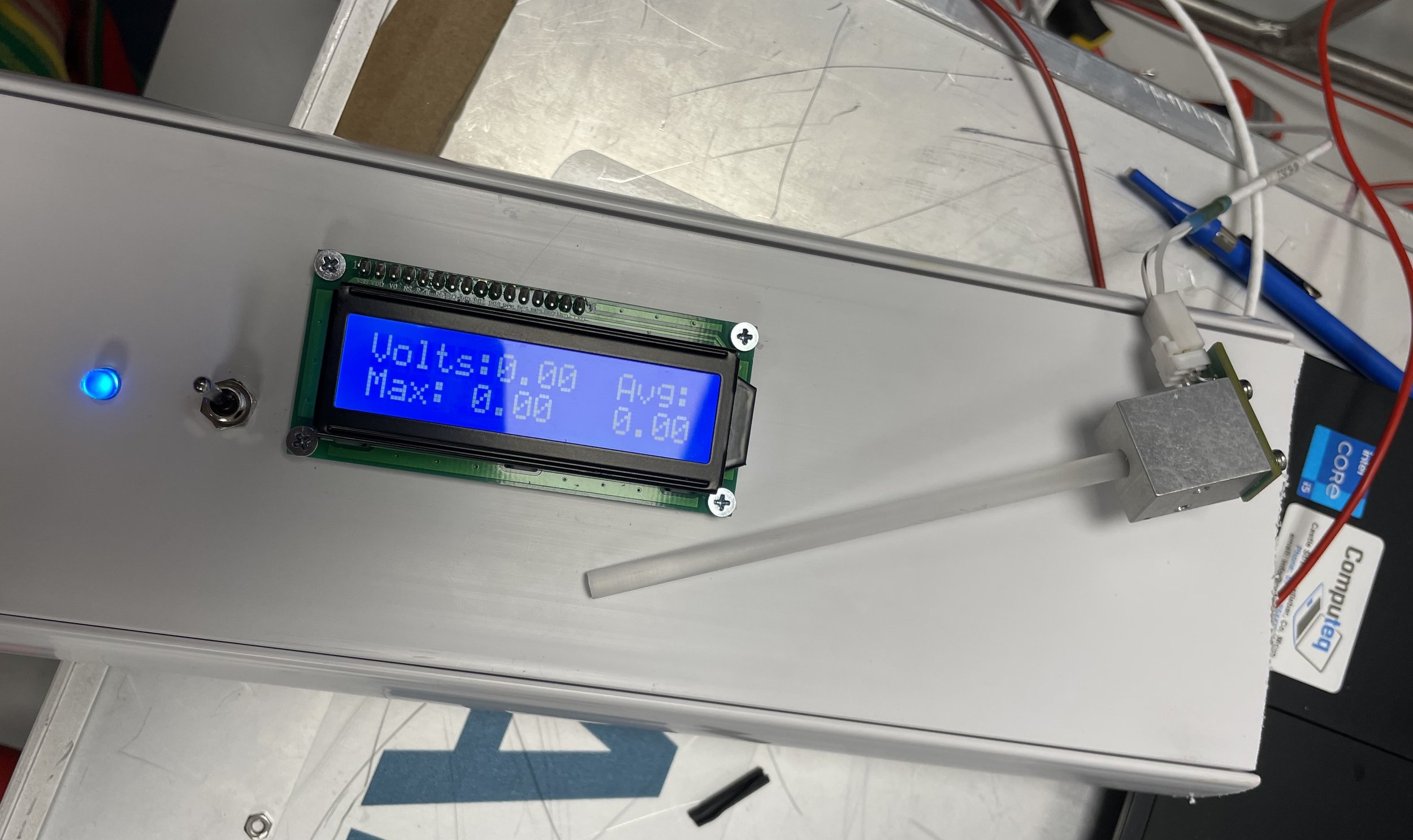 The way the sensor system works is as follows: First, you turn on the system using the toggle switch. Once the system is on, the blue LED and LCD will turn on indicating that the sensor is taking readings. The LCD displays the current voltage output of the sensor, the max voltage output, and the average voltage output from the last 20 readings above zero. Flipping the toggle switch resets the sensor and resets the maximum reading down to zero. The voltage output was correlated to readings in Joules through experimentation using other sensors and the quartz rod. The device was coded in Arduino and is powered by a separate 12V PSU box.